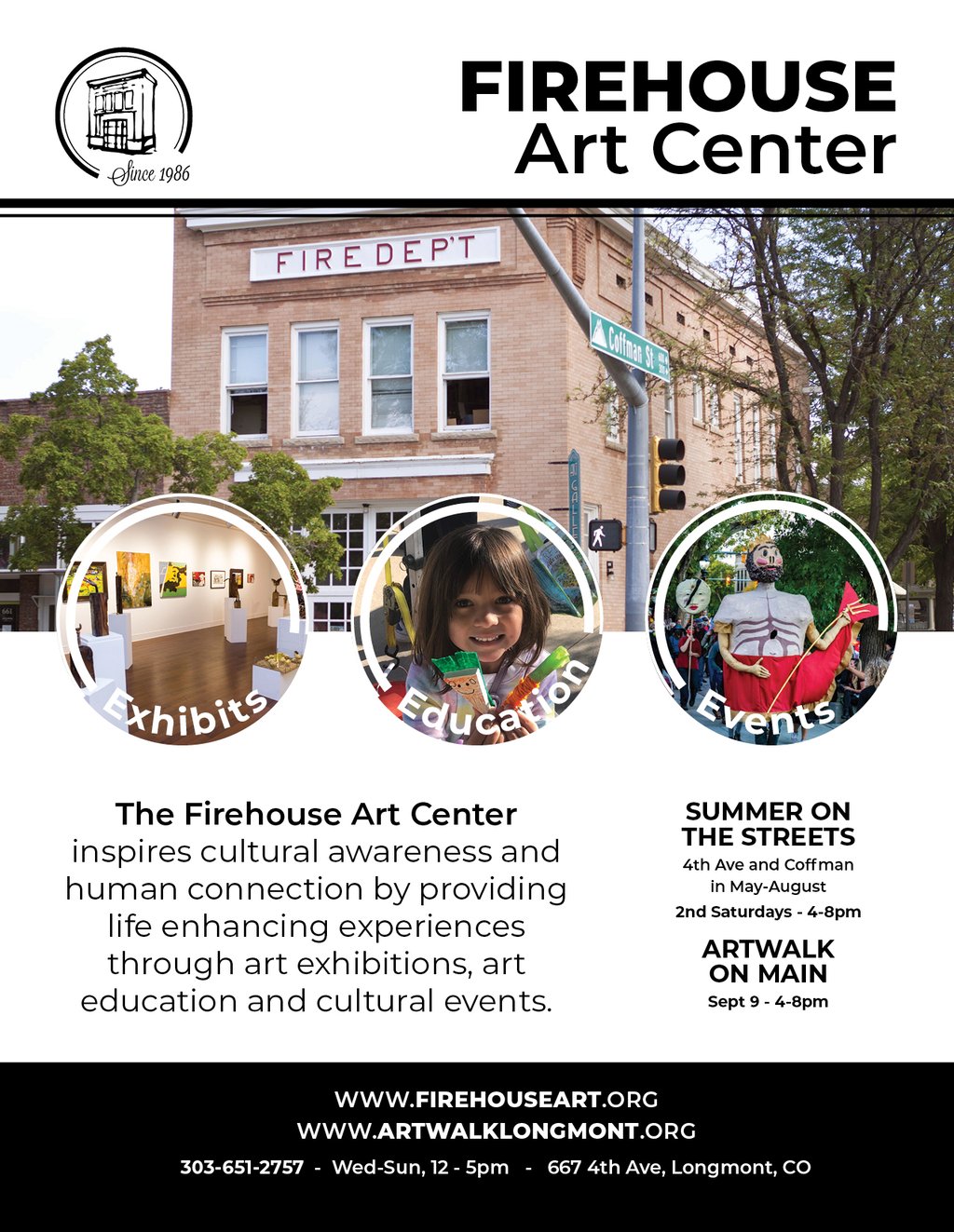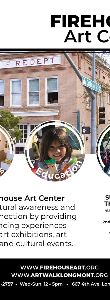 The Firehouse Art Center is one of Longmont's prominent exhibition spaces that notably shows contemporary art for local and national artists. Previous posters lacked a clear look. Section clarity and styling elements were emphasized for the poster redesign.